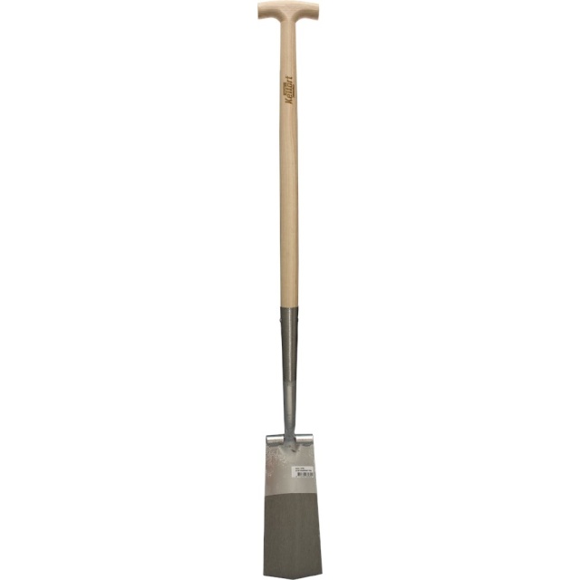 Voorzien van een spanningsvrij 3 mm gehard stalen blad, met opstapje, afgerond. Eerste kwaliteit gelakte essen steel van 950 mm, met T-greep.