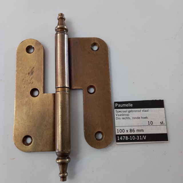 PAUMELLE SCHARNIER 100/86MM RONDEHOEK GEBRONSD STAAL VAASKNOP RECHTS.